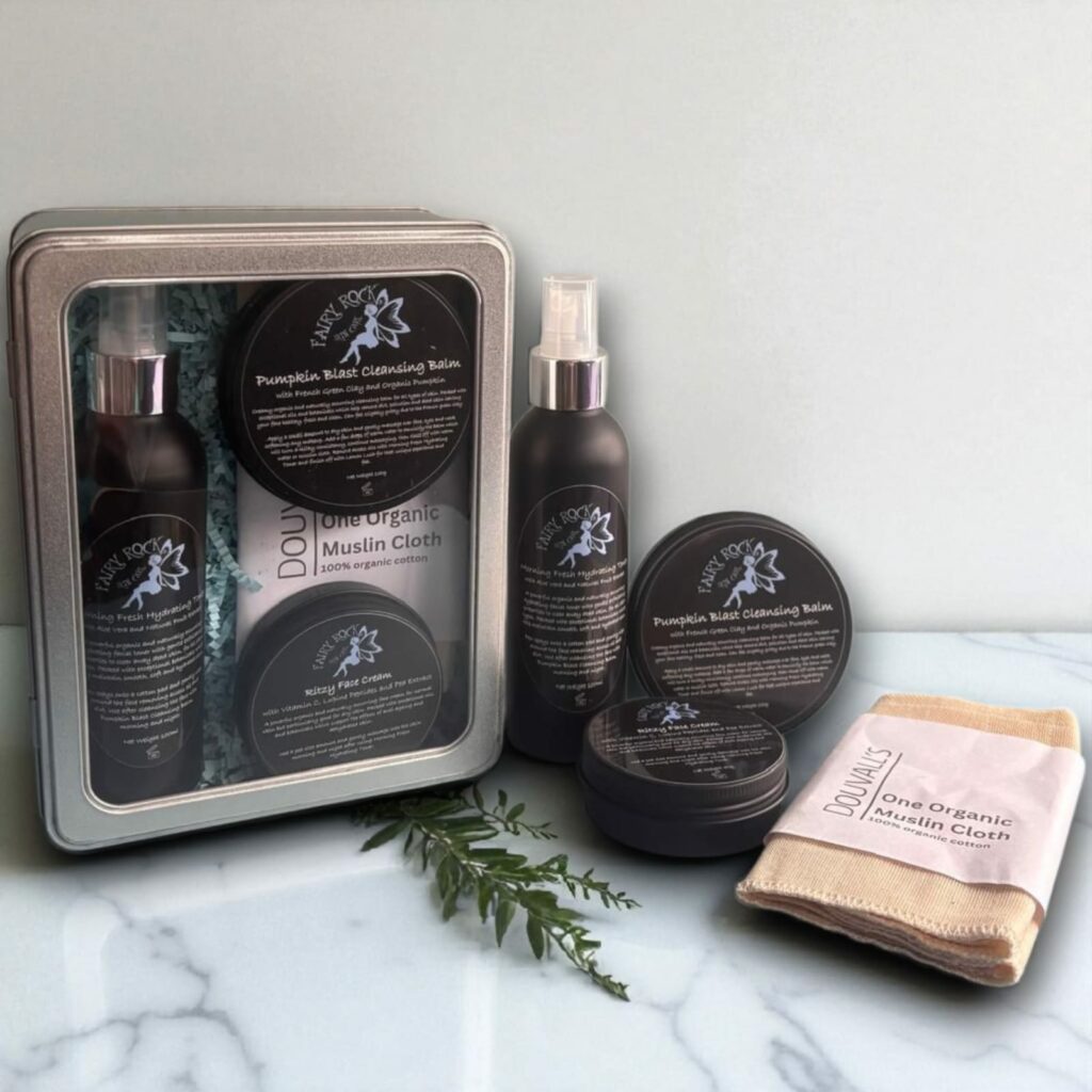 includes Ritzy Face Cream, Pumpkin Blast Cleansing Balm, and Morning Fresh Hydrating Toner, along with an organic muslin cloth, beautifully presented in a gift box.