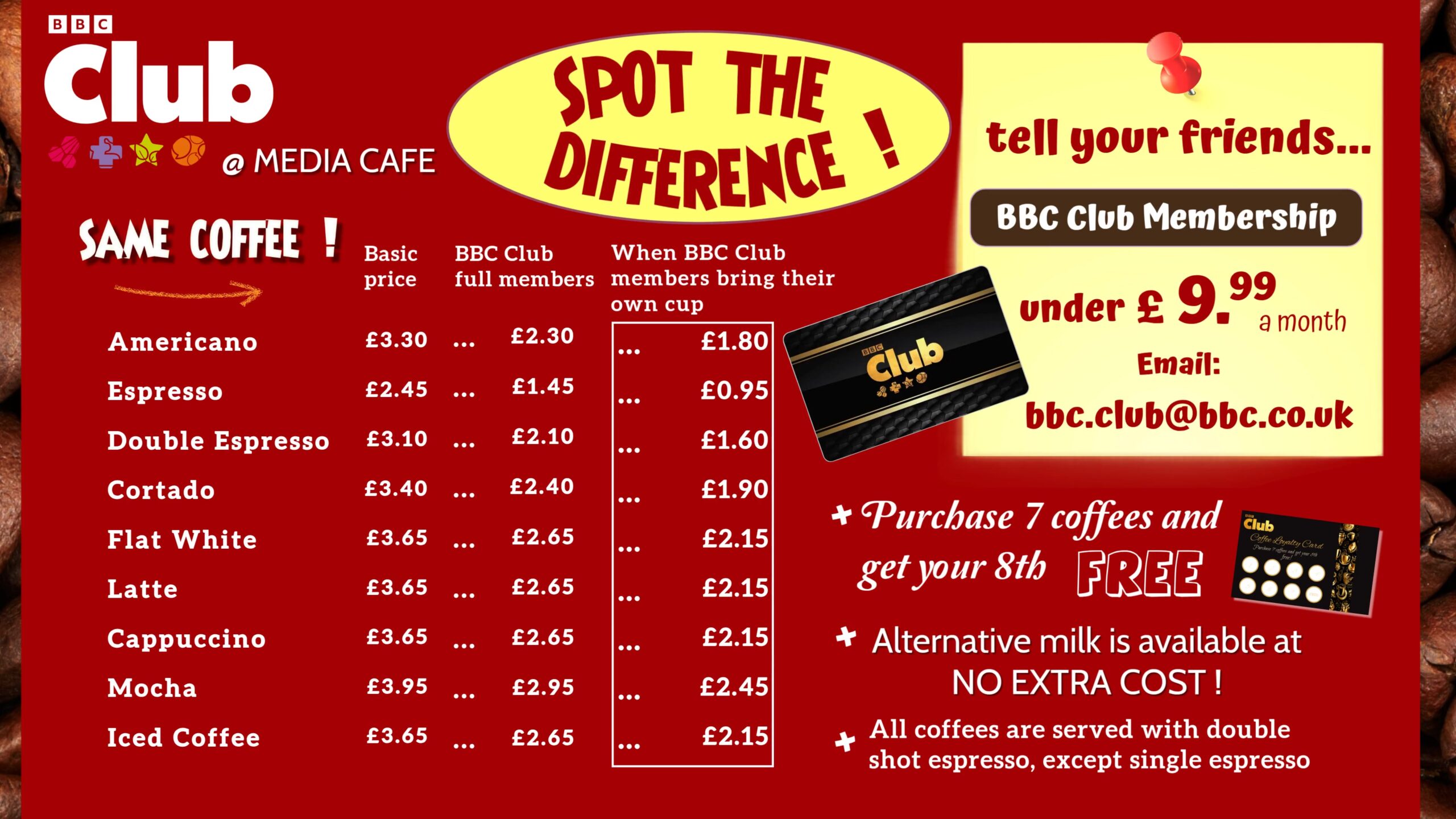 While BBC ID pass holders can access the Media Café as usual, BBC Club retired and Alumni members will need to be issued with a BBC Club pass at LBH Reception on each visit. Please ensure that you have photo ID with you.